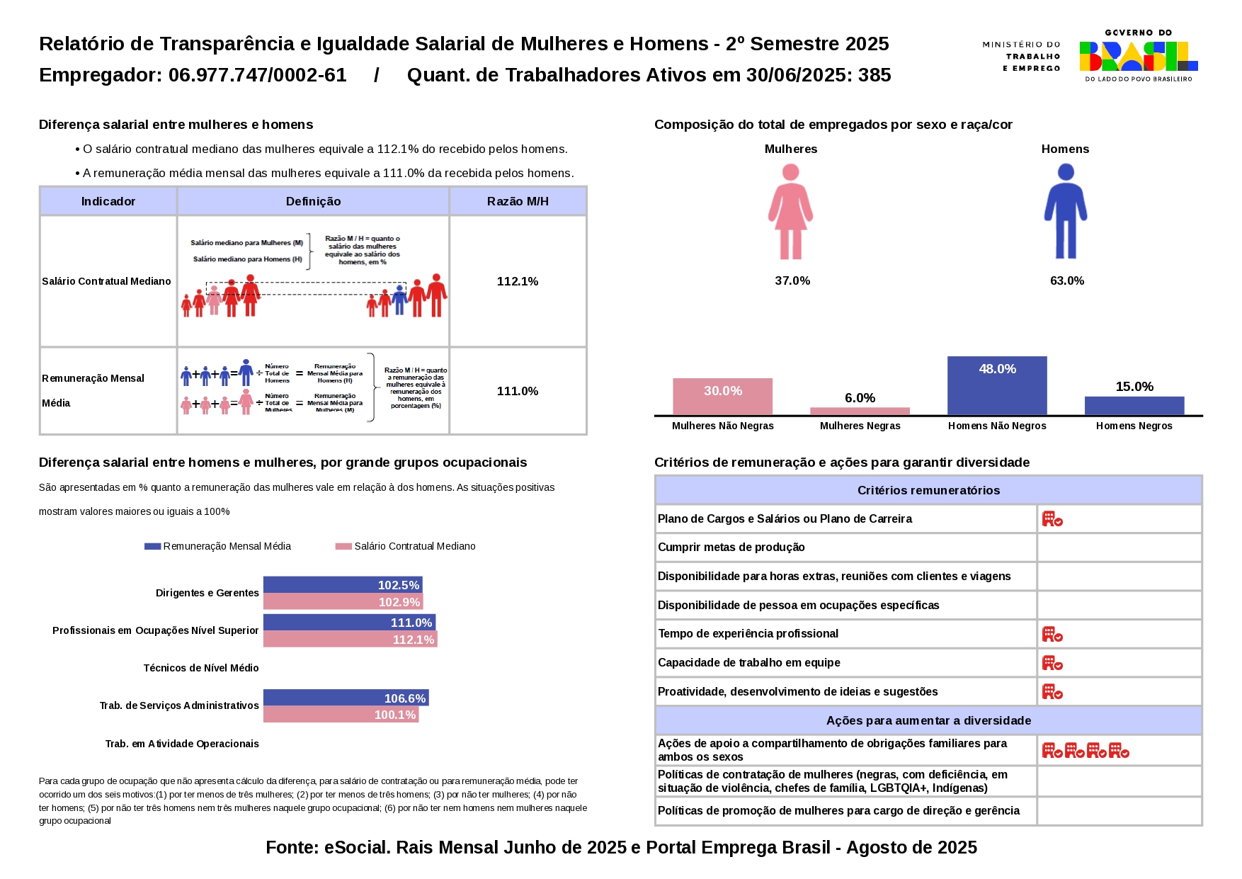 O relatório apresenta dados sobre a transparência e igualdade salarial entre mulheres e homens na unidade da empresa com CNPJ 06.977.747/0002-61, que contava com 385 trabalhadores ativos em 30/06/2025.