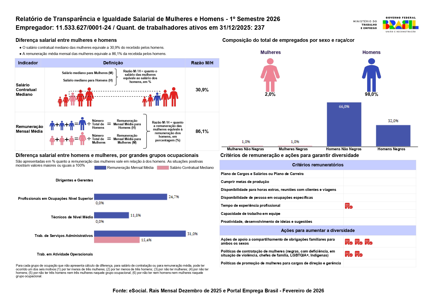 O relatório apresenta dados sobre a transparência e igualdade salarial entre mulheres e homens na unidade da empresa com CNPJ 11.533.627/0001-24, que contava com 237 trabalhadores ativos em 31/12/2025.